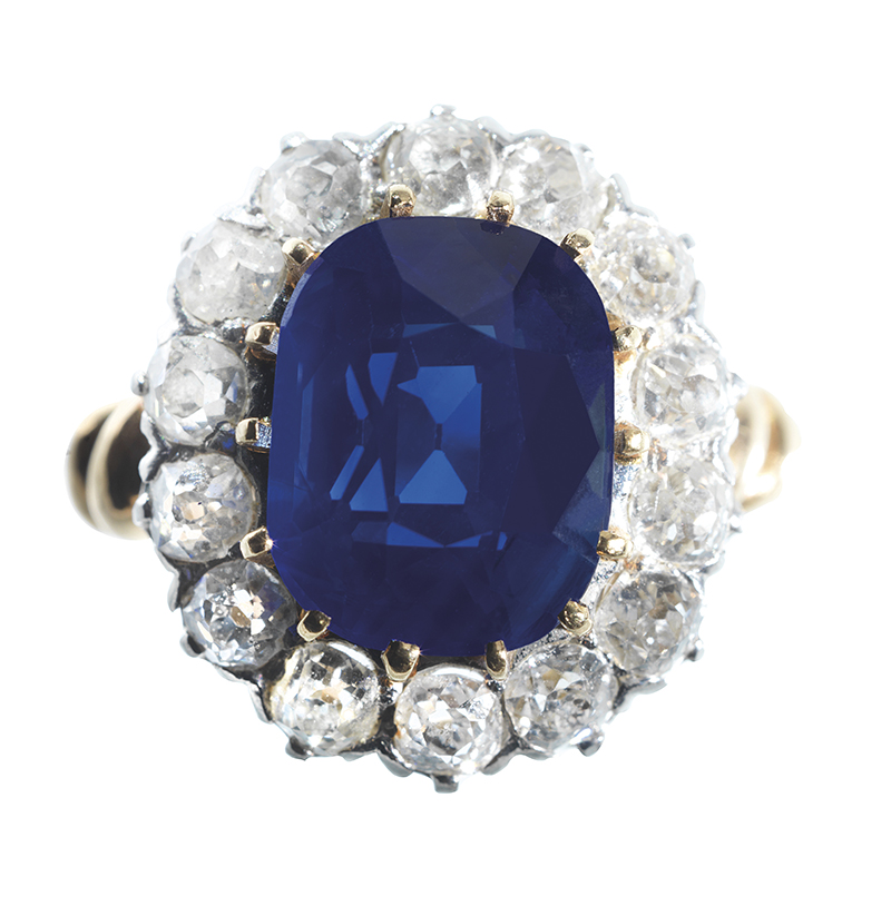EXCEPTIONNEL SAPHIR DU CACHEMIRE calibrant 6,723 carats de taille coussin, monté sur une bague marguerite en or rose 750 millièmes et platine 950 millièmes, le corps de bague torsadé présentant au centre le saphir dans un entourage orné de 14 diamants de taille ancienne pour un total d’env 1,80 cts. Vers 1890, présentée dans son écrin à la forme armoriée de la maison « H. BLANCHET » située au « 18-20 galerie de Montpensier Palais Royal Paris ». Tdd. 49. Pds Brut. 9,90 g.